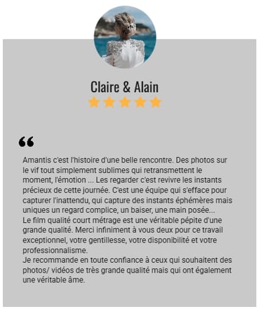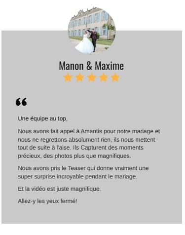 Nous avons fait appel à Amantis pour notre mariage et nous ne regrettons absolument rien, ils nous mettent tout de suite à l'aise. Ils Capturent des moments précieux, des photos plus que magnifiques.