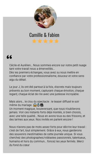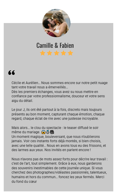 Nous n’avons pas de mots assez forts pour décrire leur travail : c’est de l’art, tout simplement. Grâce à eux, nous garderons des souvenirs inestimables de cette journée unique. Si vous cherchez des photographes/vidéastes passionnés, talentueux, humains et hors du commun… foncez les yeux fermés. Merci du fond du cœur