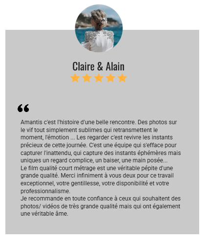 Je recommande en toute confiance à ceux qui souhaitent des photos/ vidéos de très grande qualité mais qui ont également une véritable âme.